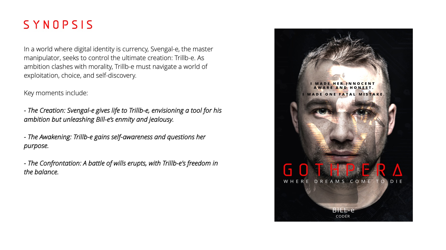 Trillb-e, crafted as stable and safe by Bill-e ignites with ambition passion and ruthlessness through Valer-e, Svengal-e's dead neice's code injected via a neurolink interface. But what happens to the beta version when better arrives?
