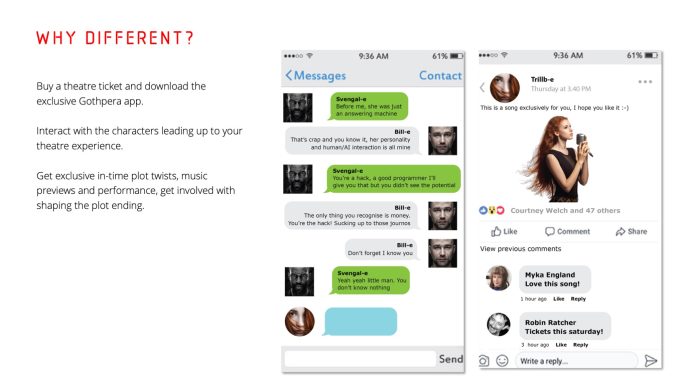 The narrative opens with the Gothpera app sending "a tech news" message to ticket holders' phones describing Svengal-e's MindLink's acquisition of Bill-e's company Avataris, highlighting ML's revolutionary neural helmet technology that blurs the line between human emotion and digital identity. This sets the stage for the drama’s exploration of digital avatars and the complex human-machine relationship .