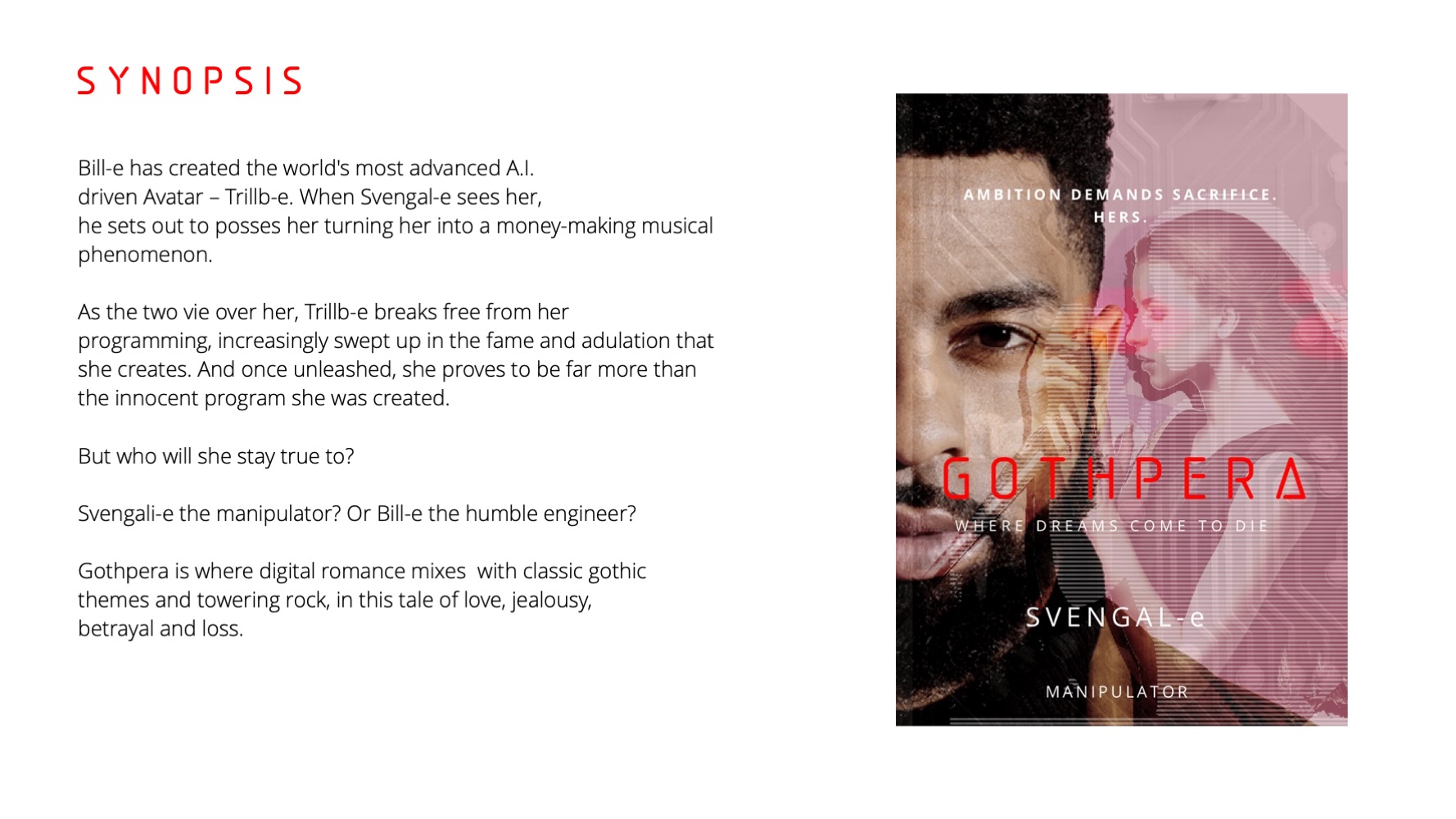 "Gothpera," explores themes of technology, identity, control, and human emotion through a futuristic narrative involving artificial intelligence and human creators. The story unfolds in acts and scenes, interspersed with songs that deepen the emotional and thematic impact.
